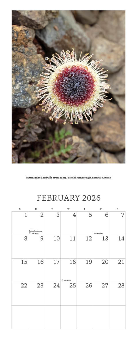 The 2026 New Zealand’s Native Flowers Calendar is a small format wall calendar featuring images taken by our leading botanical photographers. New Zealand’s native flowers are unique and beautiful and included in the calendar are photographs ranging from alpine flowers to thos…