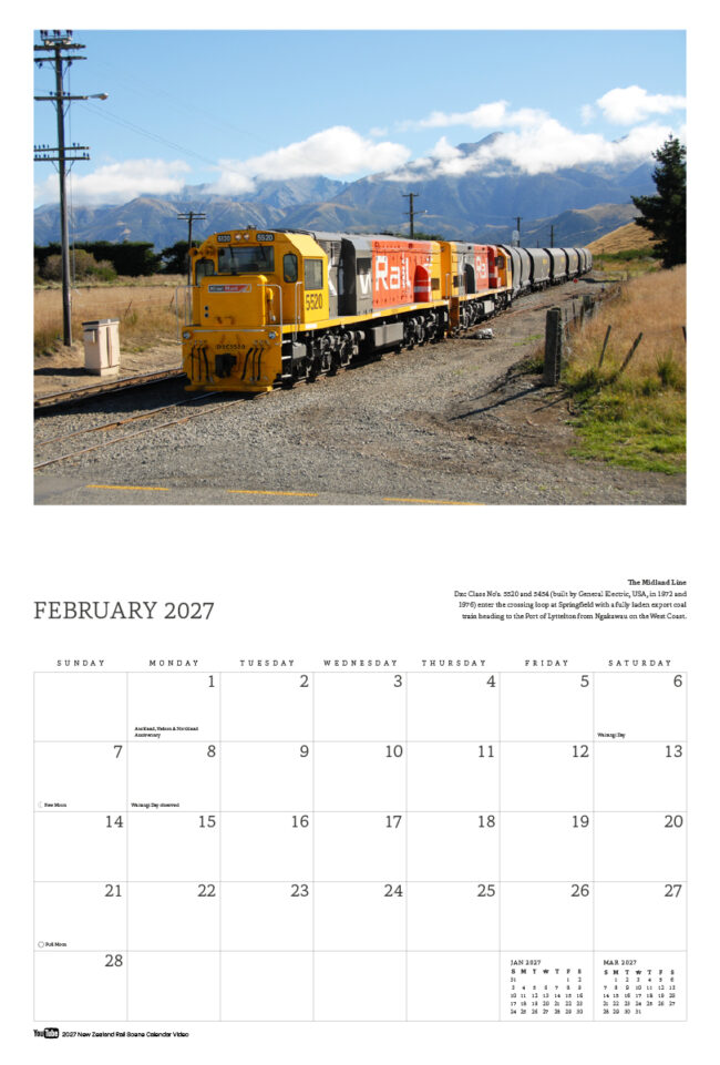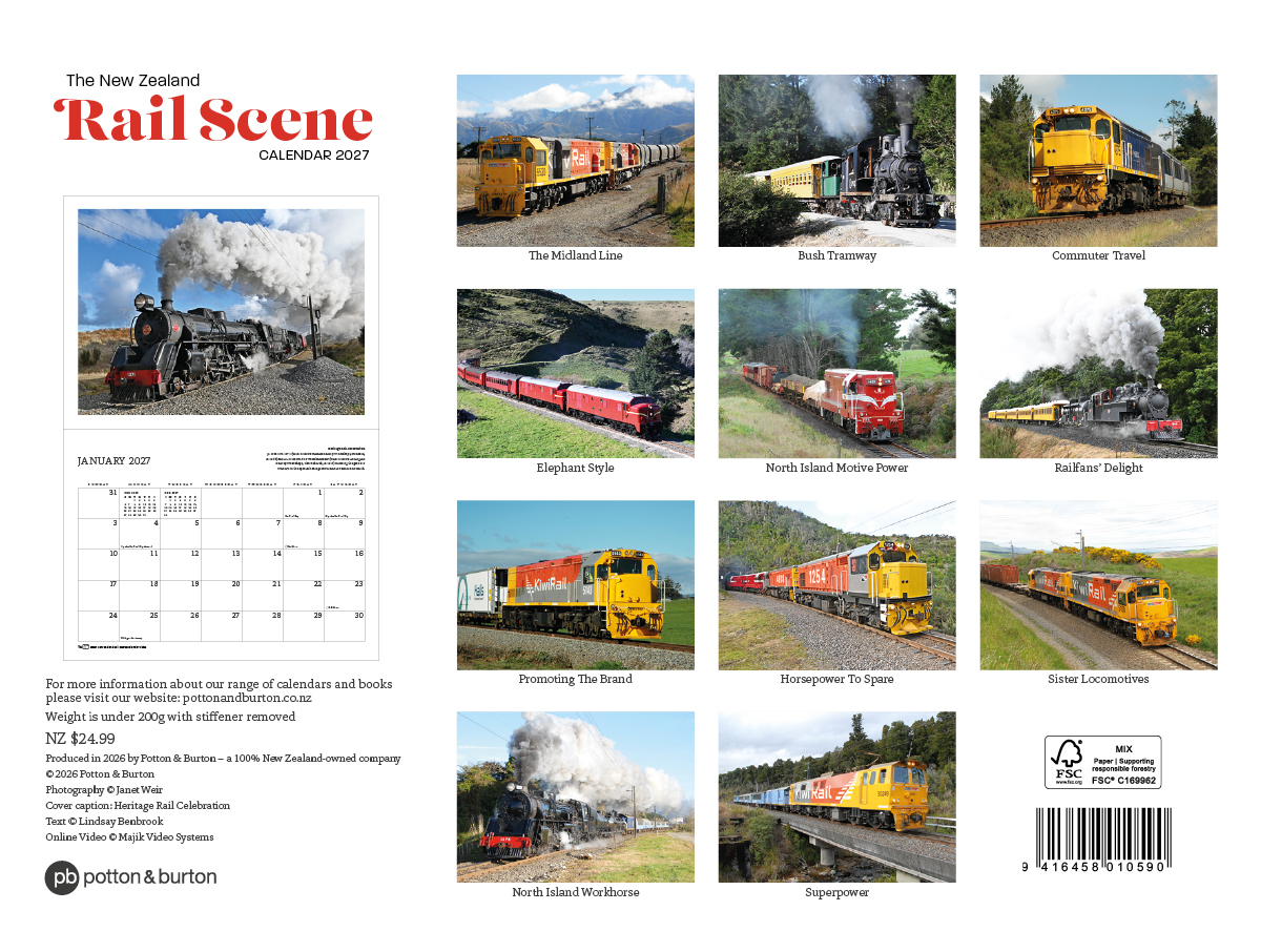 The New Zealand Rail Scene calendar is a popular calendar featuring railway scenes from across New Zealand and includes a YouTube link to a video of footage of each featured train.