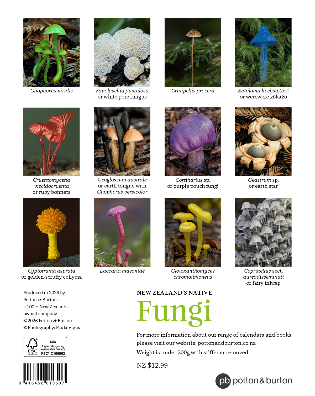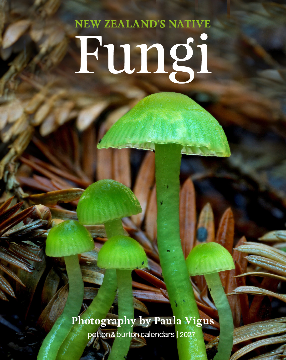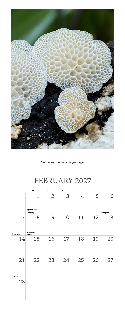 The 2027 New Zealand’s Native Fungi Calendar is a small vertical format calendar of remarkable fungi, as featured in Paula Vigus’s photographic book A Hidden World: Discovering the beauty of New Zealand Fungi.