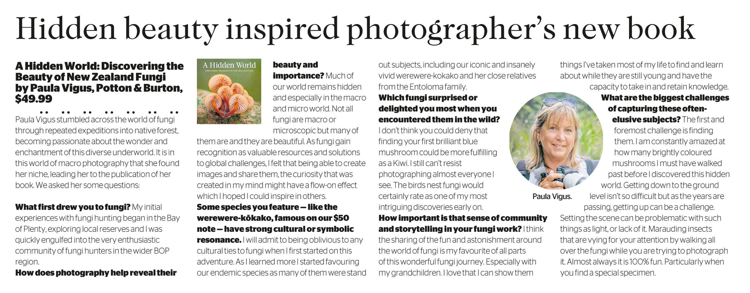 In A Hidden World she showcases the extraordinary beauty of these remarkable organisms, which play a crucial role in our ecosystems, acting as decomposers and contributing to nutrient cycling, soil health and plant growth. But because so many fungi are tiny and not easily found, most New Zealanders have no idea how remarkable this hidden world is.