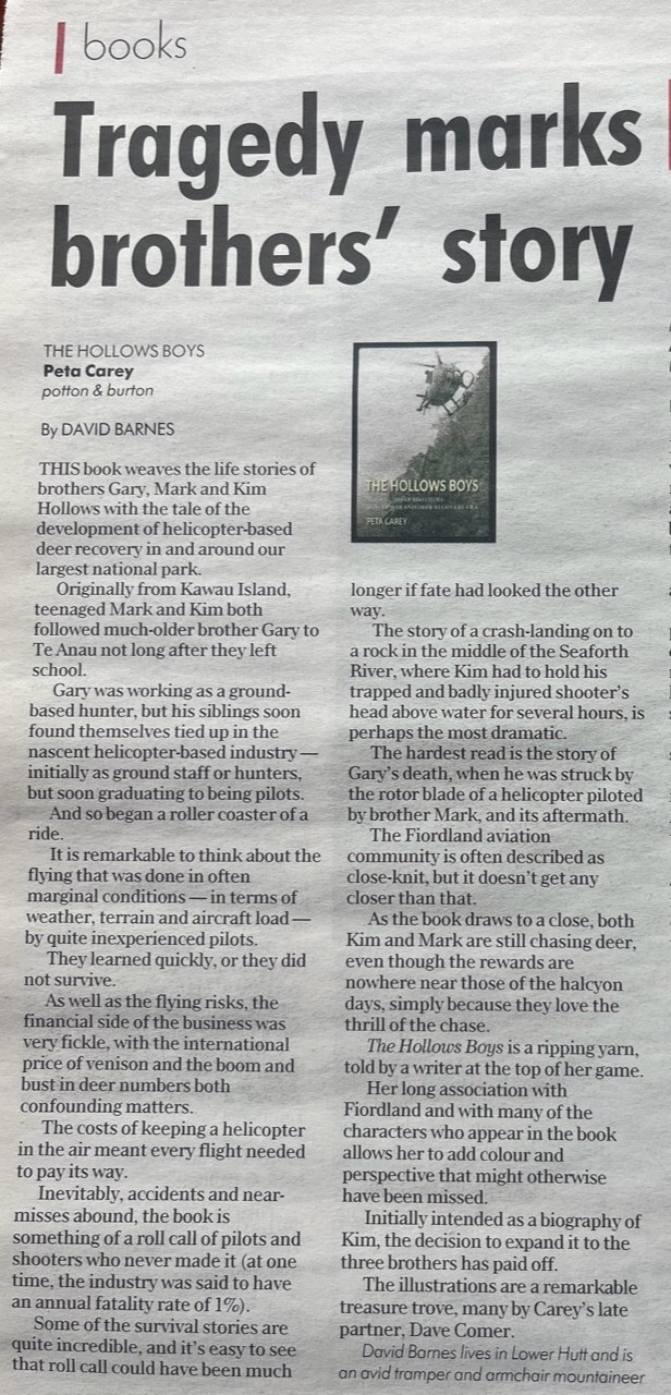 The Hollows Boys is the story of the helicopter deer recovery era in Fiordland, told through the lives of three brothers, Gary, Mark and Kim Hollows. There is the usual dare-devil ‘boy’s own adventure’ side of the story. There is extreme competition between pilots and huge sums of money at stake. But there is also the strange phenomenon of luck, the roll of the dice, the gamble on survival. Ultimately, there is the overwhelming cost – not simply wrecked machines and insurance bills, but the loss of a brother, a friend, a father or a son. And there is the legacy from that loss that many continue to endure.